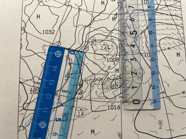 天気図上に低気圧の場所を転記したり、天気図上の距離をキロメートルや海里に変換するためには定規が欠かせません。
