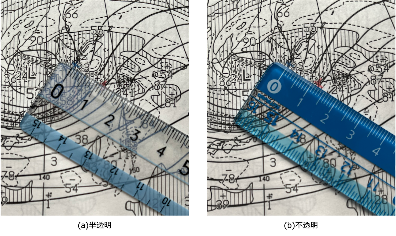 測定する対象の視認性を高めるためには、定規に色がついていない透明で、問題用紙の天気図が見える状態が好ましいでしょう。