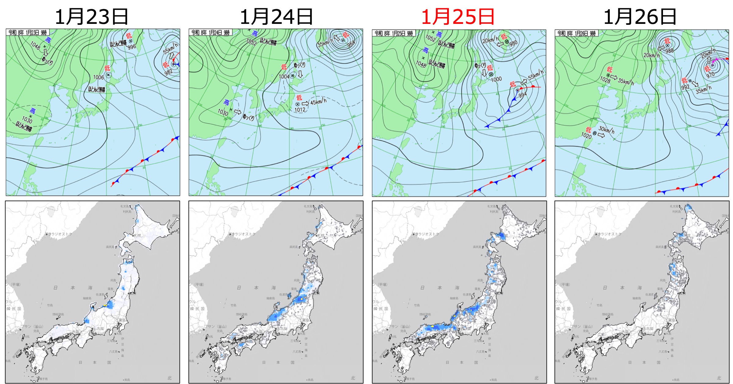 図1 天気図(上段)と前3時間降雪量(下段) 出典:気象庁天気図を加工して作成